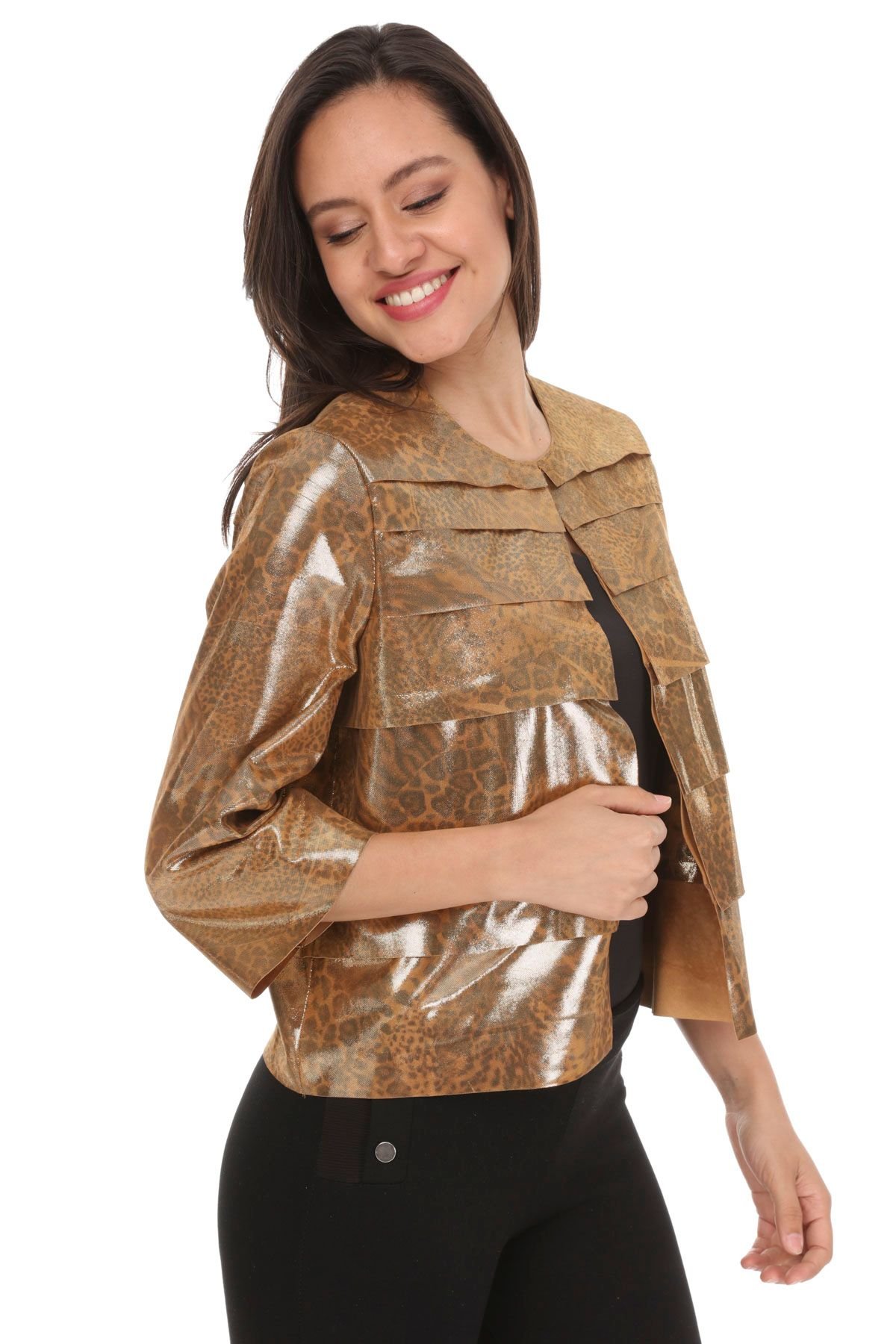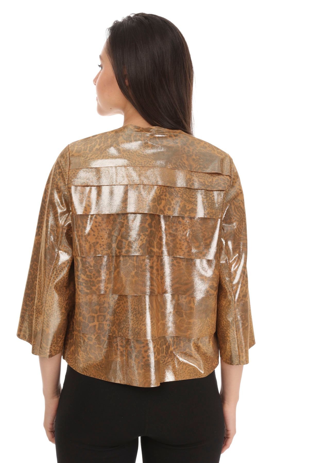Verleihen Sie Ihrem Outfit eine luxuriöse Note mit dieser exquisit gefertigten Damenjacke, einem wahren Statement-Stück für jede anspruchsvolle Garderobe. Hergestellt aus hochwertigem Schaf-Lammleder, besticht sie durch ihre robuste und dennoch geschmeidige Qualität, verziert mit einem faszinierenden goldfarbenen, hochglänzenden Finish und einem markanten Leopardenmuster. Diese Jacke ist der Inbegriff von Luxus, perfekt für besondere Anlässe, elegante Zusammenkünfte oder stilvolle Frühling-Sommer-Abendgarderobe. Ihr einzigartiges Stufendesign auf Vorder- und Rückseite erzeugt eine dynamische visuelle Textur, während die kragenlose, offene Silhouette und die eleganten Dreiviertel-Ärmel einen modernen und bequemen Sitz bieten. Konzipiert für Langlebigkeit und Komfort, sorgt ihre leichte Konstruktion für Atmungsaktivität und macht sie zur idealen Wahl für wärmere Jahreszeiten. Diese Jacke verspricht, eine zeitlose Ergänzung zu sein, die jedes Ensemble mit ihrer unvergleichlichen Qualität und ihrem markanten Design aufwertet.