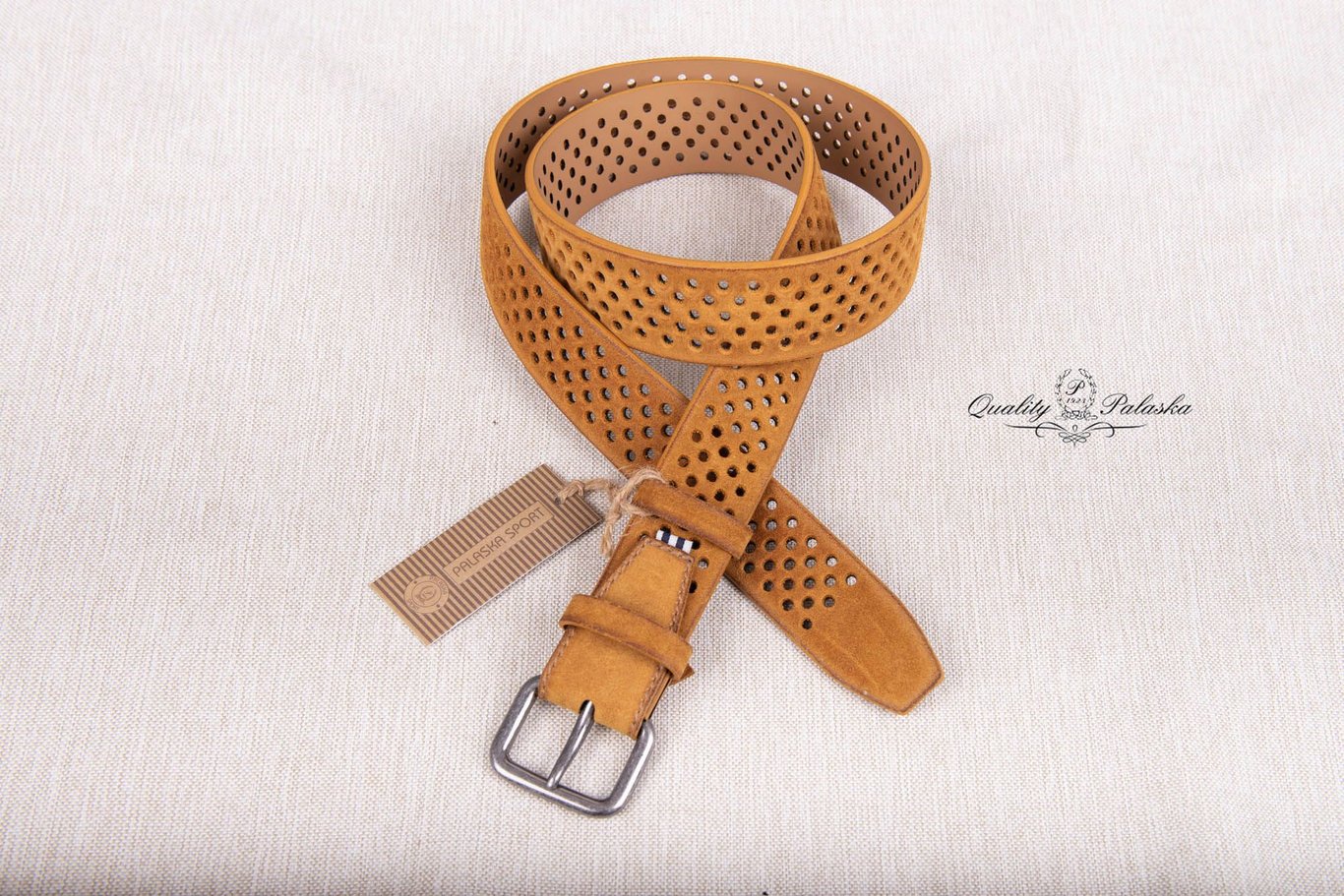 Elevate your style with this impeccably crafted men's belt, a testament to superior quality and sophisticated design. Meticulously fashioned from premium bovine calf leather, its soft suede exterior in a warm tan hue offers exceptional durability and a luxurious tactile experience. The distinctive circular perforated pattern spans the entire length, providing a modern, breathable aesthetic. Ensuring ultimate comfort, the interior is finished with a smooth, genuine leather lining. With a versatile 40mm width, this belt is perfect for transitioning seamlessly between casual and smart-casual ensembles, suitable for all seasons. A robust, silver-toned classic pin buckle complements the design, while a subtle blue, white, and red striped fabric tab near the buckle adds a unique touch of character. This belt is an essential investment in enduring style and masterful craftsmanship.