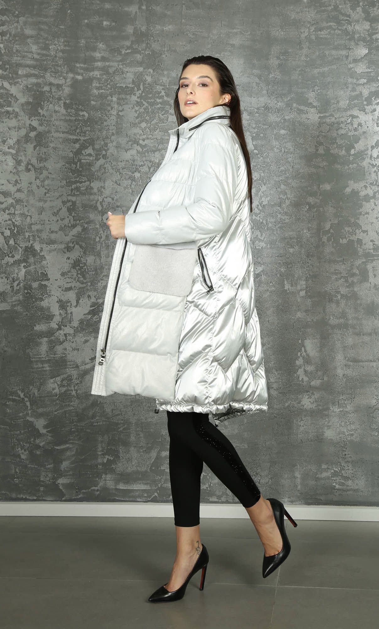 This exquisitely crafted women's long quilted coat combines superior quality with contemporary elegance, making it an essential addition to your cold-weather wardrobe. Designed for urban adventures, sophisticated casual outings, and stylish winter events, its striking platinum metallic finish ensures you stand out with effortless grace. The premium quilted metallic leather construction provides exceptional insulation, guaranteeing warmth and comfort even on the chilliest days. Featuring a practical two-way black zipper for versatile styling and ease of movement, along with a high stand-up collar and an integrated hood for added protection against the elements. Luxurious, contrasting authentic shearling patch pockets offer a soft touch and a distinctive textural element, elevating the coat's sophisticated design. Crafted from a durable, subtly iridescent metallic leather, this coat promises both fashion-forward aesthetics and reliable warmth, ensuring long-lasting style and comfort through every season.