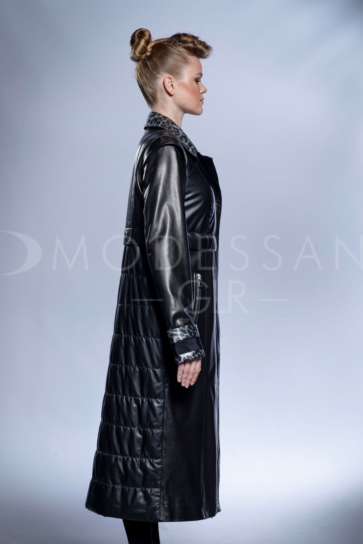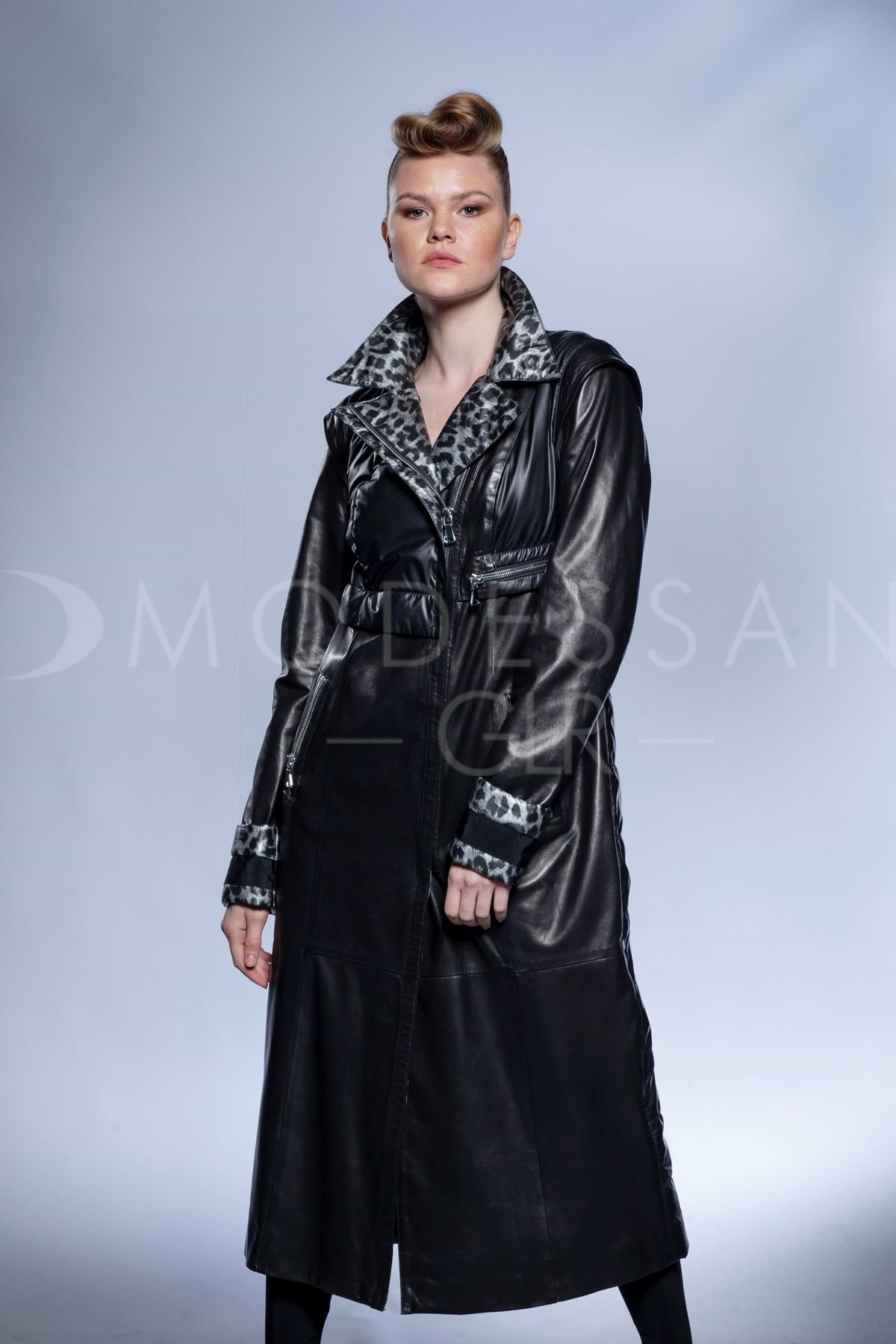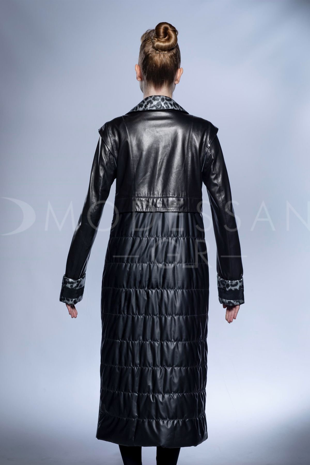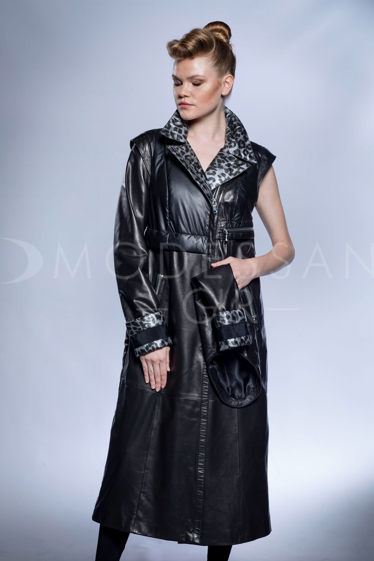 Созданное с исключительным мастерством, это длинное женское пальто является воплощением роскошного дизайна и превосходного качества. Тщательно изготовленное из эластичной овечьей кожи, оно предлагает несравненный комфорт и изысканный силуэт. Идеально подходящее для создания выдающегося образа осенью и зимой, это пальто легко переходит от элегантного вечернего наряда к шикарным повседневным ансамблям, идеально для городских прогулок или официальных мероприятий. Его поразительный дизайн включает гладкую кожаную верхнюю часть, дополненную уникальной стеганой нижней половиной, что добавляет как визуальный интерес, так и повышенное тепло. Яркая серая подкладка с леопардовым принтом, тонко проявляющаяся на изысканном воротнике-стойке и регулируемых манжетах, придает нотку игривой элегантности. Оснащенное прочными серебристыми молниями, это черное кожаное пальто обеспечивает долговечность и надежную застежку, в то время как премиальная овечья кожа обещает длительную мягкость и устойчивость к погодным условиям. Окунитесь в неподвластный времени стиль и неизменное тепло с этим изысканным кожаным шедевром.