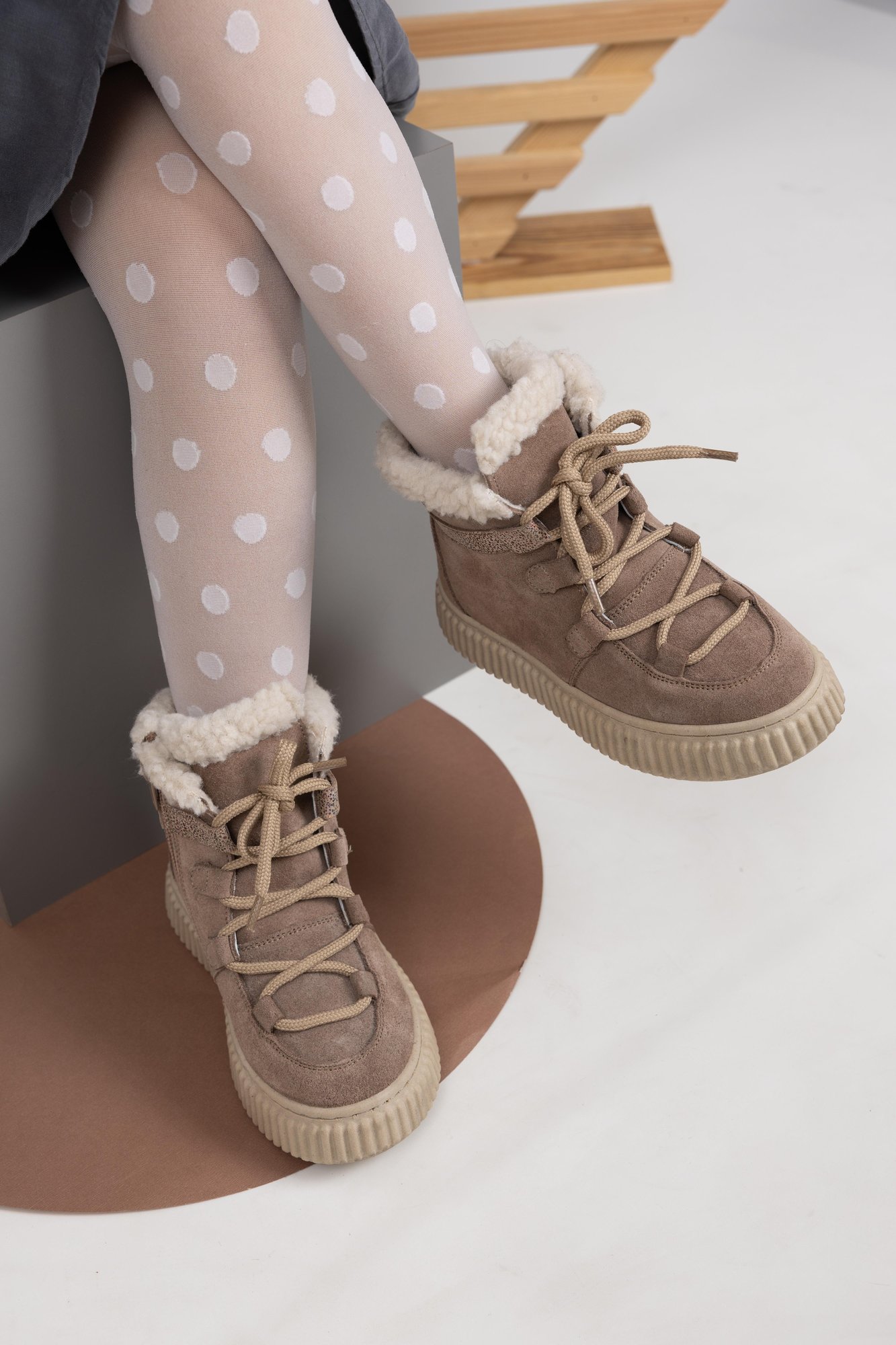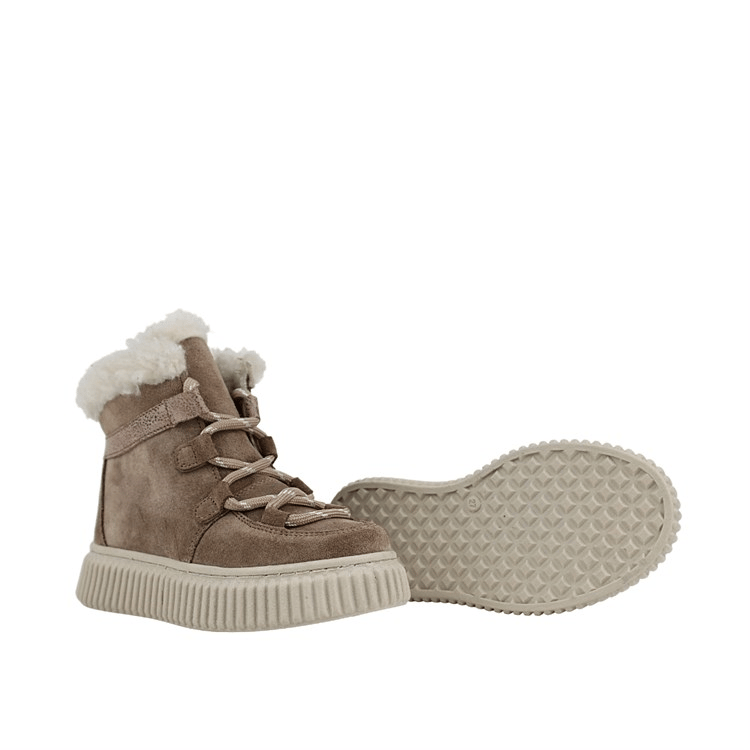 Откройте для себя идеальное сочетание стиля, тепла и прочности с нашими тщательно изготовленными детскими ботинками, созданными специально для прохладной осени и холодной зимы. Эти высокие ботинки имеют верх из высококачественной натуральной замши таупово-коричневого оттенка, предлагая изысканный, но игривый вид, который легко дополнит любой детский наряд, от повседневных школьных дней до приключений выходного дня. Превосходное мастерство проявляется в каждой детали, от точных швов до прочной конструкции, обеспечивающей исключительную долговечность, способную выдержать испытания активной молодежи. Внутри плюшевая подкладка из натурального меха обеспечивает непревзойденное тепло и роскошный комфорт, сохраняя маленькие ножки уютными и защищенными от низких температур. Отличительная толстая, рифленая подошва TPR Light кремово-бежевого цвета не только обеспечивает отличное сцепление и легкую гибкость, но и анатомическую конструкцию для оптимальной поддержки. Дополненные прочными круглыми шнурками и стильным переливающимся ремешком на щиколотке, эти ботинки являются обязательным элементом гардероба, обещая долговечное качество и высший комфорт в каждом морозном приключении.